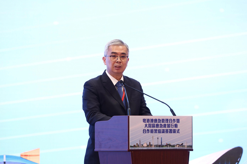 2024年6月14日,粵港澳三地政府在香港簽署《粵港澳應急管理合作暨大灣區應急救援行動合作框架協議》。簽署儀式在國家應急管理部副部長徐加愛、國務院港澳辦室務會成員向斌、廣東省常務副省長張虎、香港政務司司長陳國基及澳門保安司司長黃少澤共同見證下,分別由廣東省應急管理廳廳長王再華、香港保安局局長鄧炳強及澳門警察總局局長梁文昌代表粵港澳三地政府簽署。
