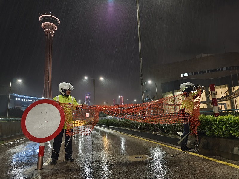 因應“摩羯”的逼近,氣象局於昨(5)日上午11時發出藍色風暴潮警告,並呼籲市民做好防風防水浸的準備。八號風球期間,西灣大橋下層行車道於昨(5)日晚上11時正開放予輕型汽車和特許車輛通行,三條澳氹跨海大橋及蓮花大橋於晚上11時30分封閉。