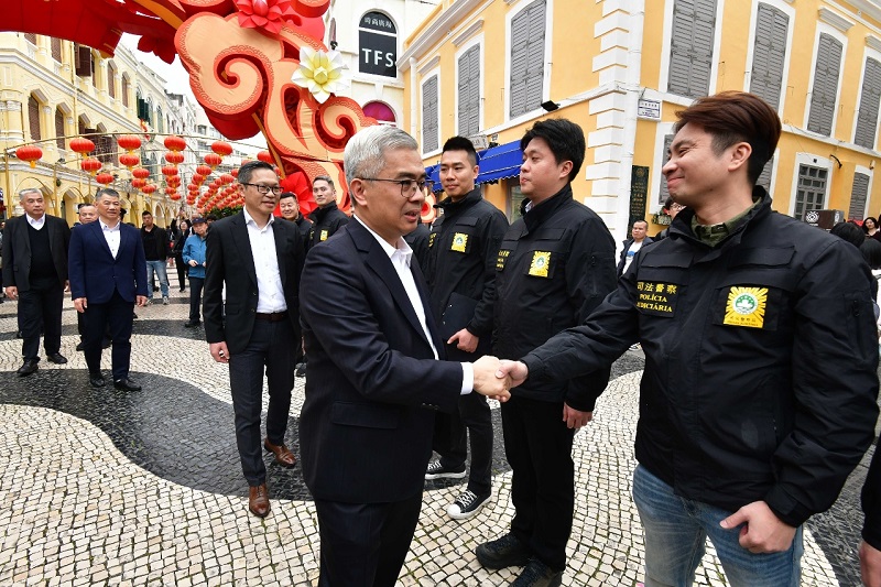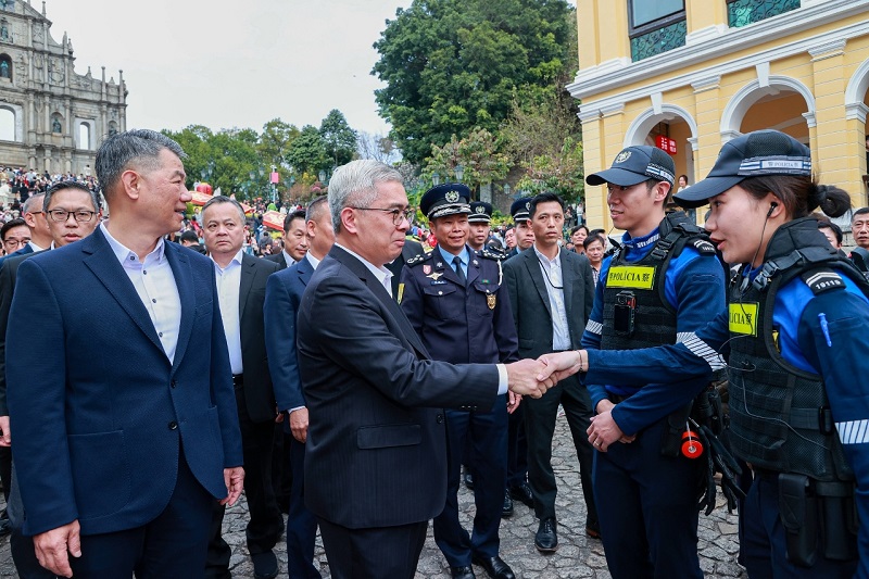 Durante o período do Ano Novo Lunar, realizou-se em Macau uma série de actividades de celebração em diferentes zonas da cidade. Para assegurar uma passagem de Ano Novo tranquila e em segurança, os agentes das forças e serviços de segurança mantiveram-se nos seus postos durante os feriados, garantindo deste modo a estabilidade, a segurança e a ordem pública, ao mesmo tempo que prestavam um serviço de excelência aos cidadãos e turistas. O Secretário para a Segurança, Wong Sio Chak, acompanhado pelo Comandante-geral dos Serviços de Polícia Unitários, Leong Man Cheong, pelo Director-geral dos Serviços de Alfândega, Adriano Marques Ho, e pelo pessoal de direcção e chefia das forças e serviços de segurança, fez no presente dia (3.º dia do Ano Novo Chinês), vistoria às unidades de trabalho da linha da frente e apresentou cumprimentos aos colegas que se encontravam de serviço.