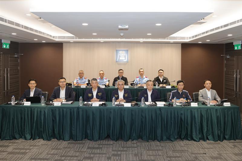 Secretário para a Segurança e comandante de Acção Conjunta, Wong Sio Chak, e representantes dos serviços públicos, na conferência de imprensa sobre os trabalhos de resposta à passagem do super tufão “Ragasa”.
