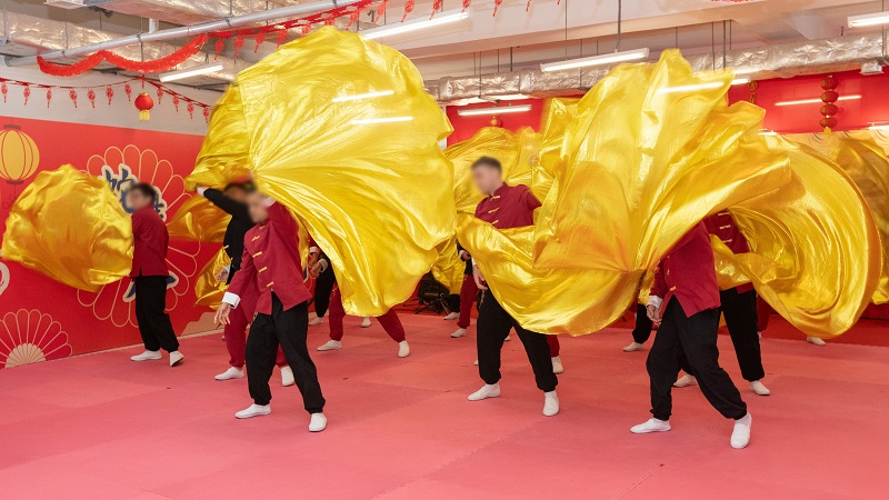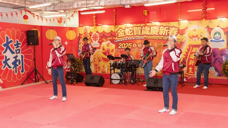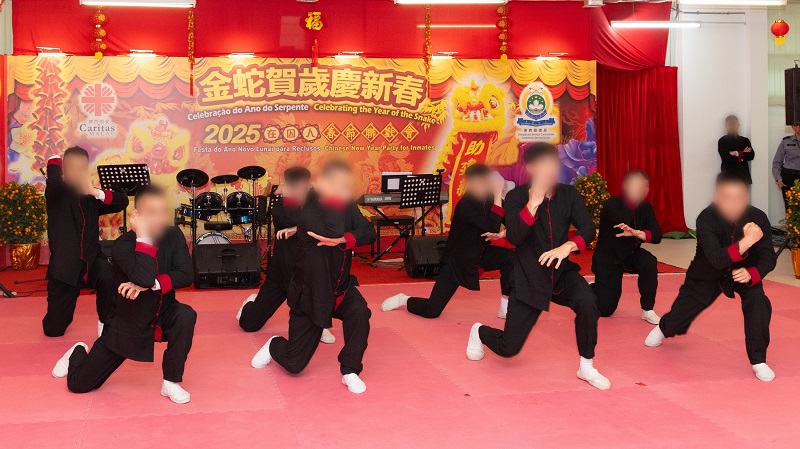 Na manhã do dia 15 de Janeiro, participaram na primeira sessão da festa os representantes convidados de vários órgãos do governo e organizações de serviço social e presidiram à cerimónia de vivificação de leões o Secretário para a Segurança, Wong Sio Chak, o Director da DSC, Cheng Fong Meng, e o Secretário-geral da Cáritas de Macau, Pun Chi Meng. Com o som dos gongos e tambores, deu-se início oficialmente à Festa do Ano Novo Lunar. Na festa, os reclusos fizeram sucessivamente diversas apresentações, incluindo dança do leão, coro multilingue, dança de bandeiras, artes marciais chinesas, dança do guarda-chuva e interpretação de canções originais. As apresentações ricas e vibrantes mostraram plenamente os talentos dos reclusos, recebendo aplausos entusiásticos de todos. Por fim, a festa terminou de forma memorável com um emocionante coro em conjunto.