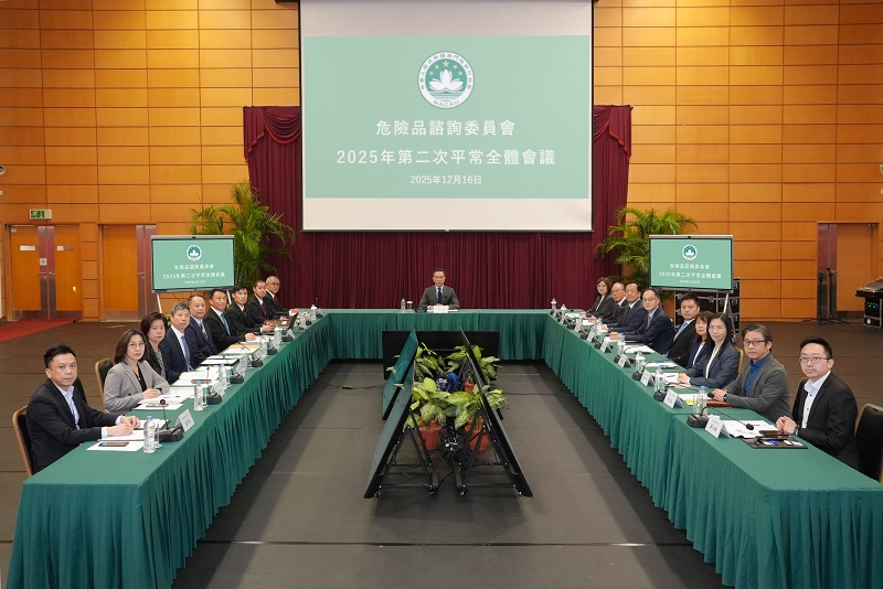 No período da tarde do dia 16 de Dezembro de 2025, a Comissão Consultiva para as Substâncias Perigosas (doravante designado por “Comissão”) realizou a 2.ª reunião plenária ordinária do ano 2025, no Comando e Posto Operacional do Lago Sai Van do Corpo de Bombeiros (CB). A reunião foi presidida pelo Presidente da Comissão, o Secretário para a Segurança, Chan Tsz King, tendo os trabalhos sido conduzidos de forma a permitir o intercâmbio e discussão sem reservas sobre os vários temas, entre os membros da Comissão.