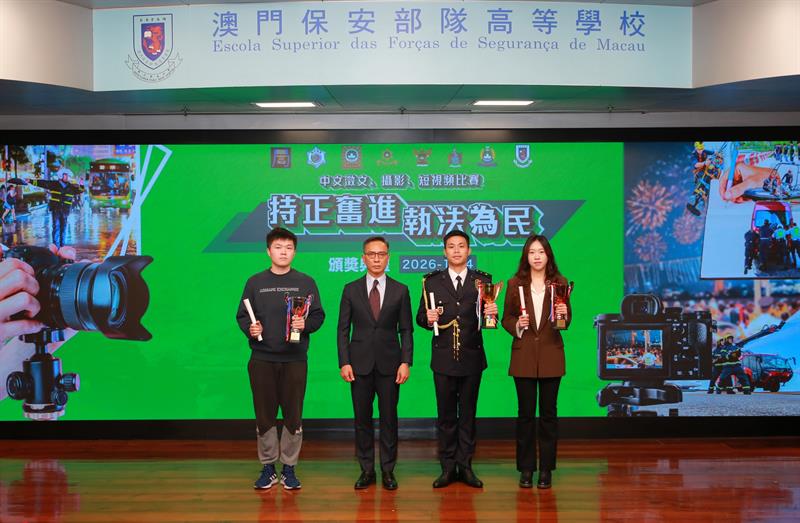 No dia 14 de Janeiro, a cerimónia de entrega dos prémios dos concursos de composição em língua chinesa, de fotografia e de vídeo de curta-metragem sob o tema de “Persistir no caminho certo para maior avanço e aplicar a lei em prol da população”, co-organizados pelas forças e serviços de segurança de Macau e realizados pela Escola Superior das Forças de Segurança de Macau, doravante designada por ESFSM, teve lugar na ESFSM, a qual foi presidida pelo Secretário para a Segurança, Chan Tsz King, e na qual contou com a presença do Director dos Serviços de Ligação para os Assuntos Policiais do Gabinete de Ligação do Governo Popular Central na Região Administrativa Especial de Macau, Wang Qianjin, o Comandante-geral dos Serviços de Polícia Unitários, Leong Man Cheong, o Director-geral dos Serviços de Alfândega da RAEM, Adriano Marques Ho, os membros do Conselho Geral, dirigentes das forças e serviços de segurança, os membros do Conselho Científico-Pedagógico, os membros da comissão de avaliação dos concursos, os vencedores de cada grupo e os representantes das instituições de ensino superior e das escolas secundárias, perfazendo um total de cerca de 180 pessoas, as quais apreciaram, em conjunto, os trabalhos excepcionais dos vencedores e testemunharam este momento de glória.